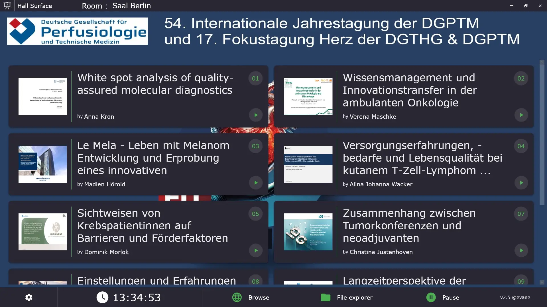 In den Veranstaltungsräumen sorgt die klare Präsentationsoberfläche für einen reibungslosen Ablauf aller Vorträge. Direkt vor jedem Hörsaal informieren digitale Displays mit dem Live-Programm über den aktuellen und nächsten Programmpunkt – so behalten Ihre Teilnehmer stets den Überblick. Für Ihre wissenschaftlichen Beiträge bietet das System zudem eine moderne ePoster-Ausstellung, die zum digitalen Austausch einlädt.